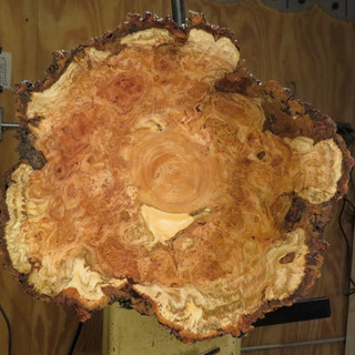 The process of turning a burl into a bowl is really one of alchemy. It involves changing (transmutation) an ordinary looking chunk of wood (the burl) into a magnificent bowl. The images below show the story of turning a cherry burl into a beautiful cherry bowl. The 15" diameter burl wrapped completely around a 5" diameter log. Cutting the burl immediately exposes the potential of the burl, but turning it into a bowl reveals its beauty. The bowl shows colorful patterns that were hidden in the burl. This is the process that wood turners, wood alchemists, love to do. This bowl is 15" in diameter and now needs about two months to dry. Sanding and oiling will complete the process of the transmutation of a burl into a bowl for all to enjoy.